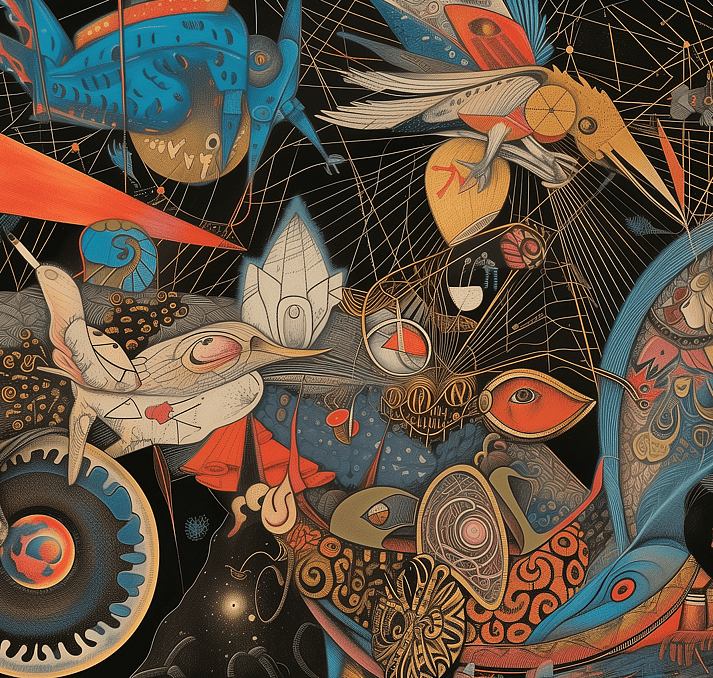 An original New Zealand print influenced by Pacifc art and produced using contemporary art methods of AI and Photoshop.